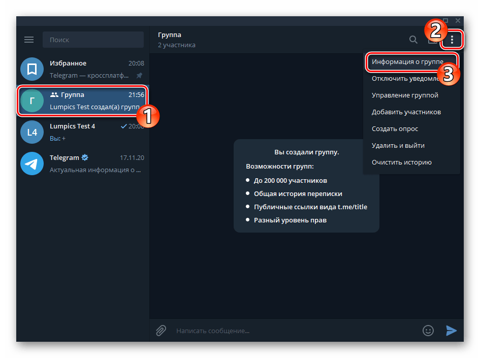 Перейдите в сформированную группу, кликните по трём точкам вверху окна Telegram справа и выберите «Информация о группе».