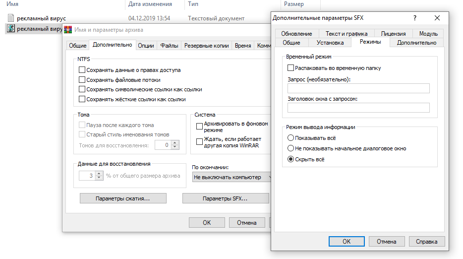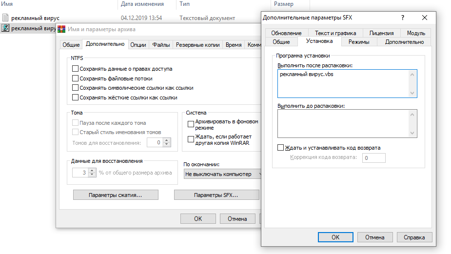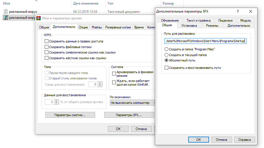 Переходишь во вкладку «Дополнительно»- «Параметры SFX» и добваляешь путь для распаковки вируса:
