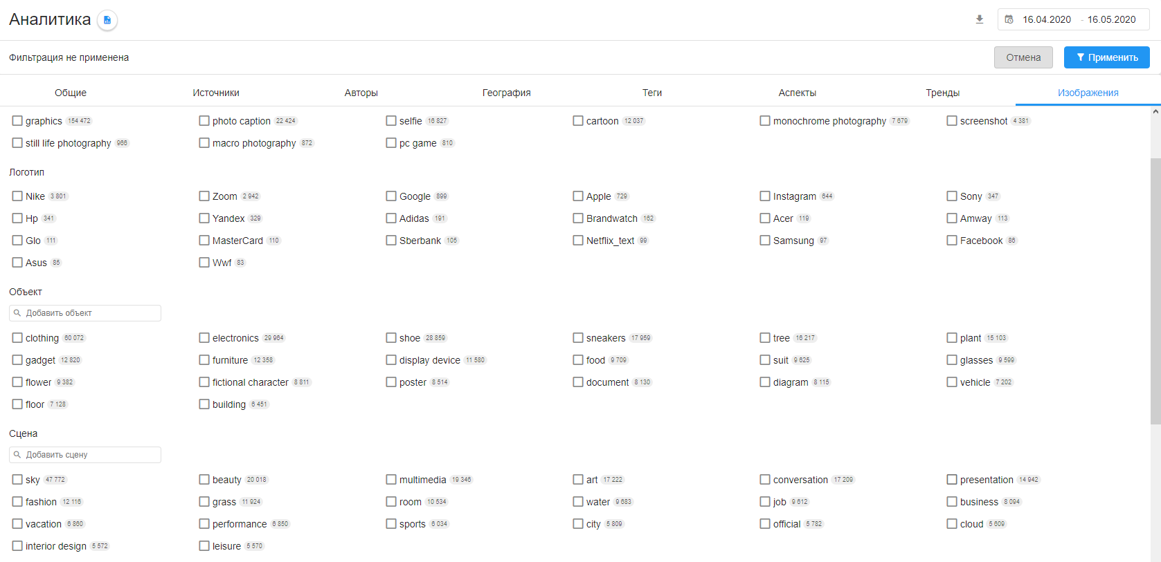 Ещё есть распознавание логотипов и надписей. Сервис YouScan находит упоминания бренда на фото, иллюстрациях, скриншотах по лого, даже если в тексте не упомянуто название бренда — достаточно, чтобы на опубликованной пользователем фотографии или картинке присутствовал логотип.