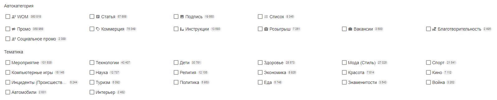 Всего система определяет около 30 автокатегорий, но это не значит, что они равнозначны. Чаще придётся сталкиваться с «хитами»: WOM (Word of Mouth) — пользовательский контент, статьи, промо и коммерция.