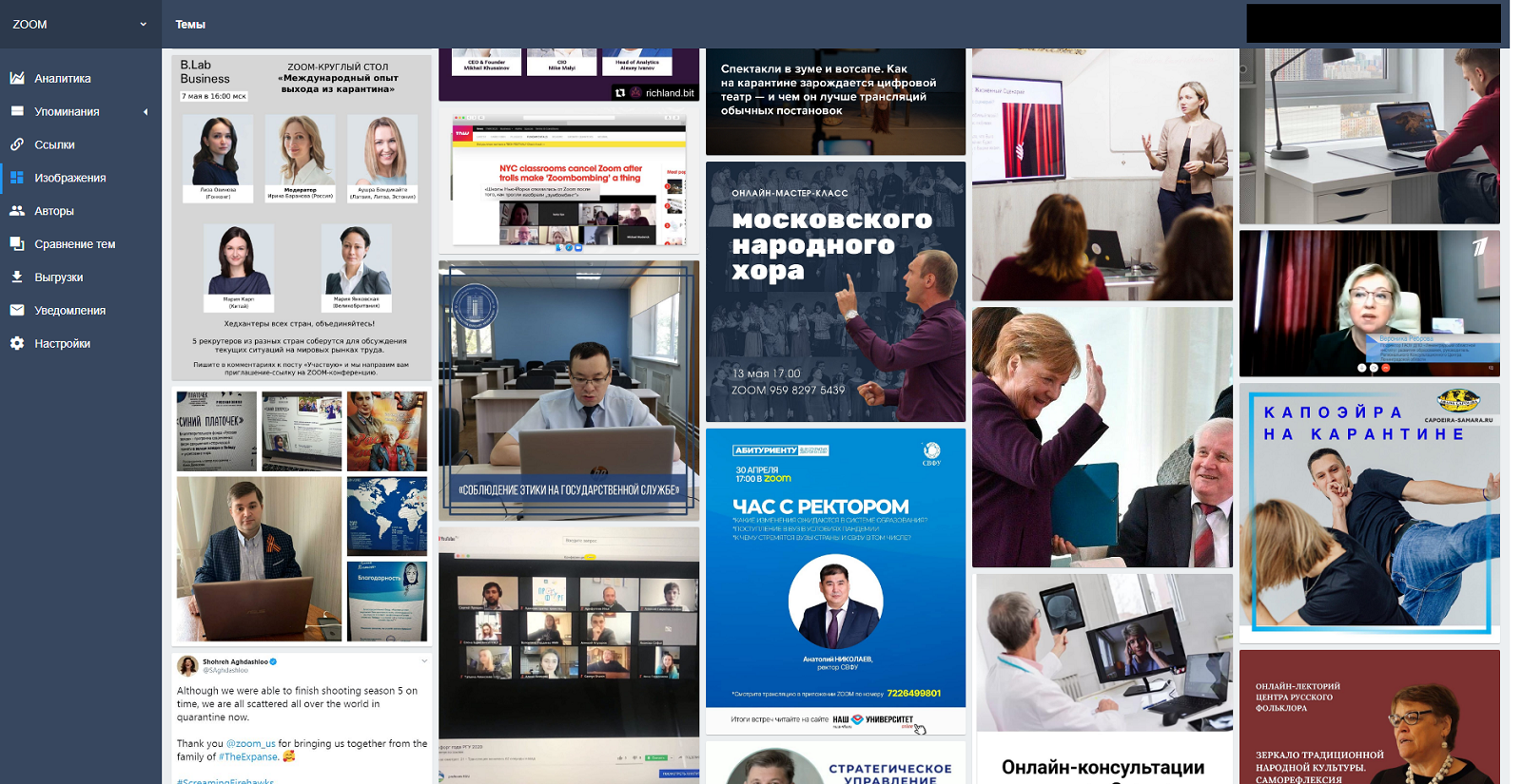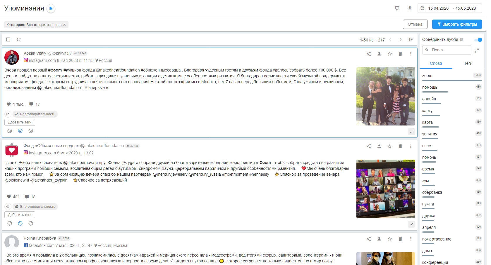 Допустим, PR-отдел планирует оценить пользу продукта для благотворительных организаций. В этом случае нас интересует автокатегория «благотворительность». Далее выбираем нужную тематику. Если хотим посмотреть мероприятия, которые стали возможны благодаря Zoom, выбираем «мероприятия».