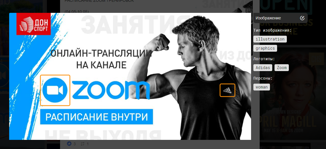 YouScan распознал логотипы Zoom и Adidas, но решил, что на картинке женщина