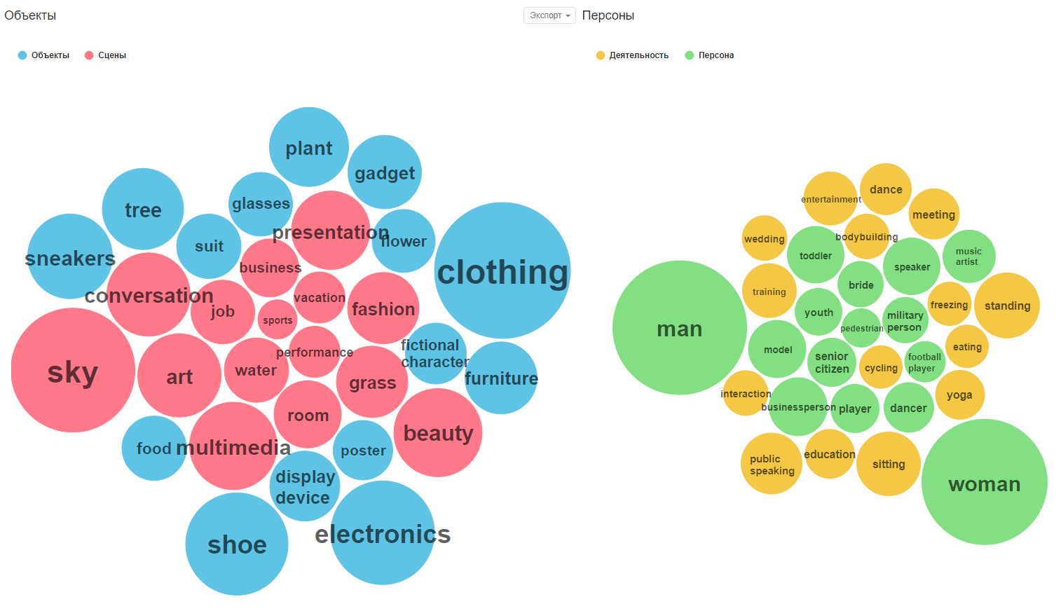 Листать все изображения не обязательно — система разделяет их по содержанию. На скриншоте сверху видно, как работают визуальные инсайты. Чем больше облако, тем чаще встречается объект, сцена или вид деятельности. Допустим, нас интересуют изображения с презентациями. Кликаем на нужное облако и вот что получаем.