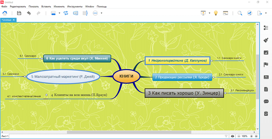 Xmind заслуживает внимания: у этой программы много возможностей. Они позволяют более эффективно манипулировать мыслительным процессом. Этот: