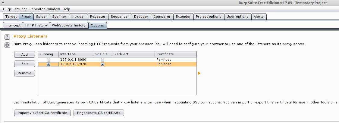 Переходим во вкладку Proxy -> Options. Там в самом верху в Proxy Listeners нажимаем Add и добавляем новый прослушиватель: на любом не занятом порту, например, 7070. В качестве Specific Address выберите IP компьютера атакующего (т.е. той машины, где запущен Burp).