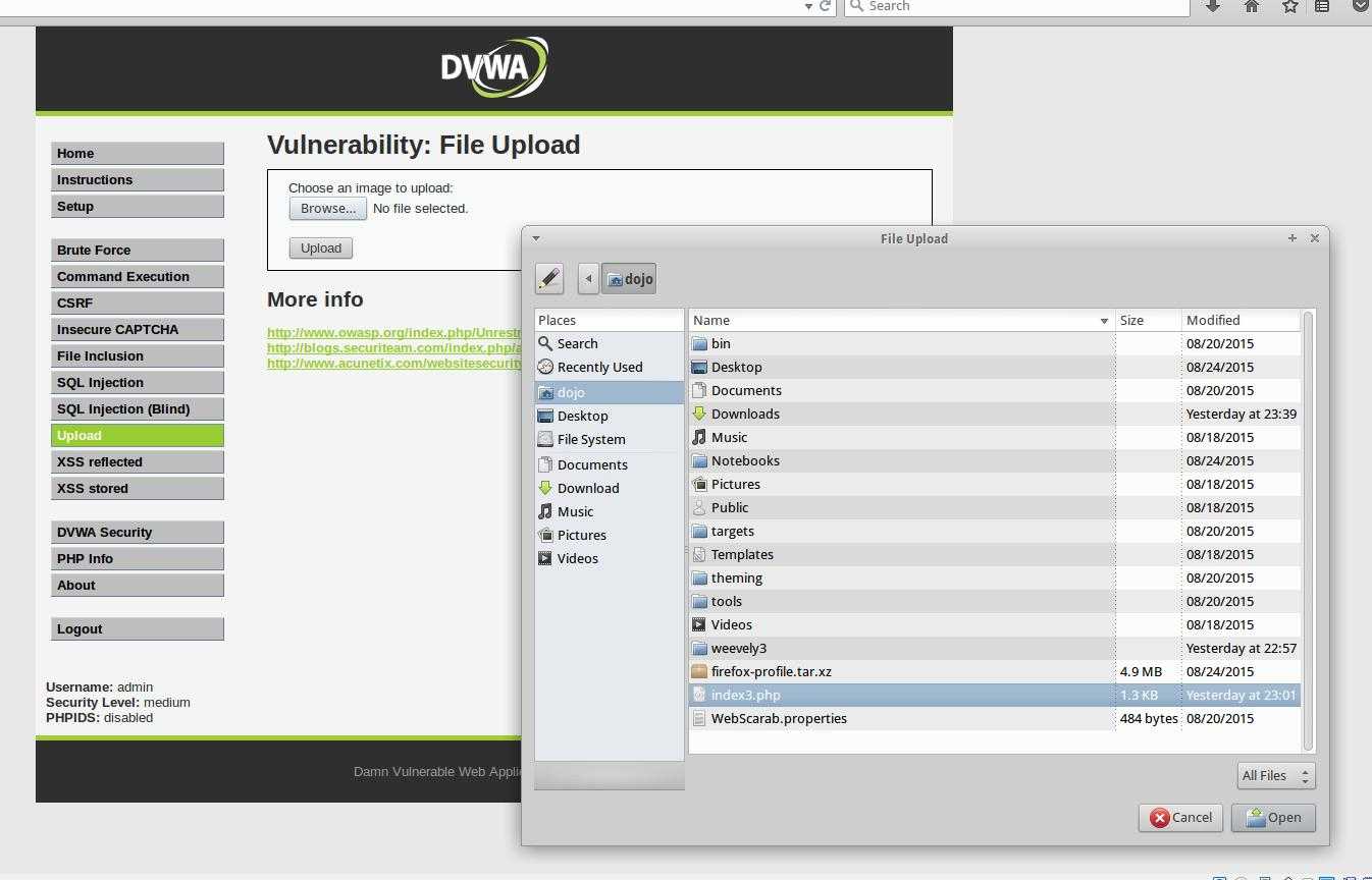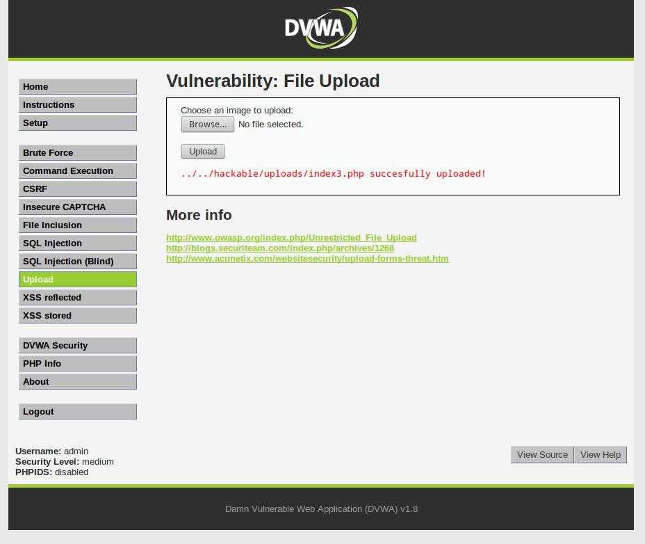 Теперь возвращаемся к DVWA и пытаемся выгрузить файл с бэкдором index3.php: