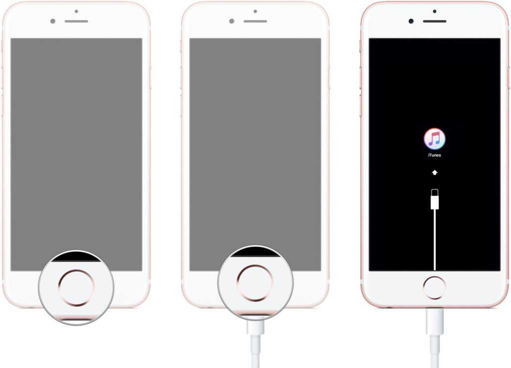 Подключив телефон к компьютеру с помощью кабеля, необходимо зажать кнопки включения и «Домой» (для моделей от 7 и выше кнопка «Домой» меняется на клавишу уменьшения громкости). На дисплее высветится значок «яблоко». После этого остается лишь следовать указаниям на экране компьютера.
