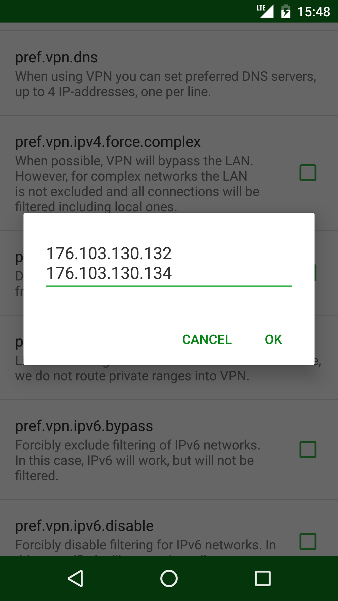 Перейдите в Настройки -> Расширенные -> Низкоуровневые настройки -> pref.vpn.dns и впишите адреса наших серверов: