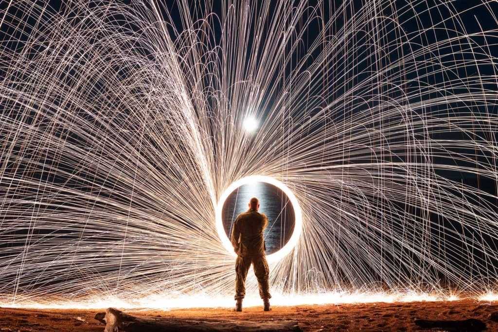 3,5”, f/5, ISO 800, ФР 35мм. Здесь я поместил в венчик для взбивания стальную вату и попросил ассистента поджечь и крутить его. Разлетающиеся искры дали подобный эффект на выдержке 3,5 секунды. Я использовал ISO 800, чтобы кроме искр, проявился передний и задний план. Александр Ипполитов