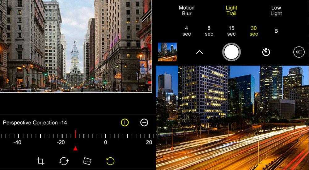 Есть немало функций и для видеосъемки: блокировка баланса белого, блокировка фокуса, съемка видео с паузой, функция Pre-shot, позволяющая снимать до момента нажатия на кнопку спуска, съемка динамических сцен и экспо-брекетинг, съемка по таймеру, таймлапс. Платная версия с полным набором функций стоит менее 1 доллара.