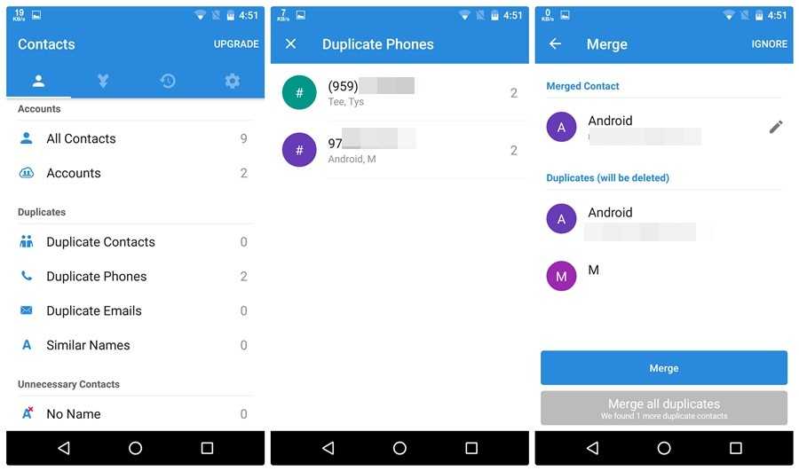 В магазине Google Play есть много приложений, которые позволяют объединять повторяющиеся контакты, однако у некоторых из них нет хорошего пользовательского интерфейса, в то время как другие работают только как слияние контактов Google.