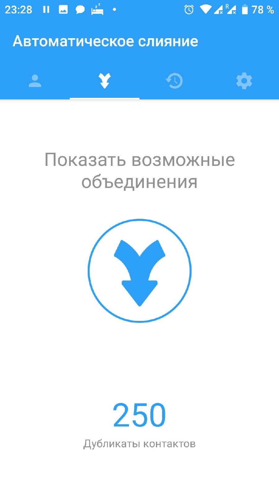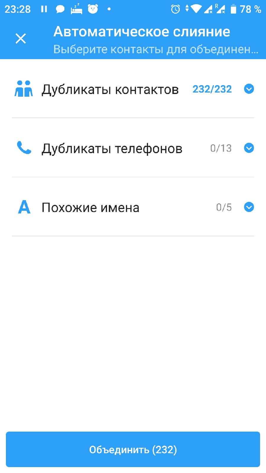 Делаем нажатие на большую синюю кнопку с соединяющимися стрелками. Во всплывающем меню, выбираем какие данные будут затронуты и тапаем на кнопку «Объединить» внизу экрана.