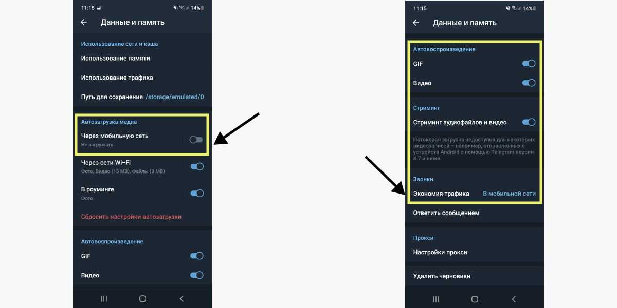 Чтобы ограничить загрузку, переведите бегунок «Через мобильную сеть» в разделе «Автозагрузка медиа» в неактивное положение. Далее пролистайте вниз, чтобы в разделе «Автовоспроизведение» перевести бегунок в режим неактивного и отключить «GIF» и «Видео».