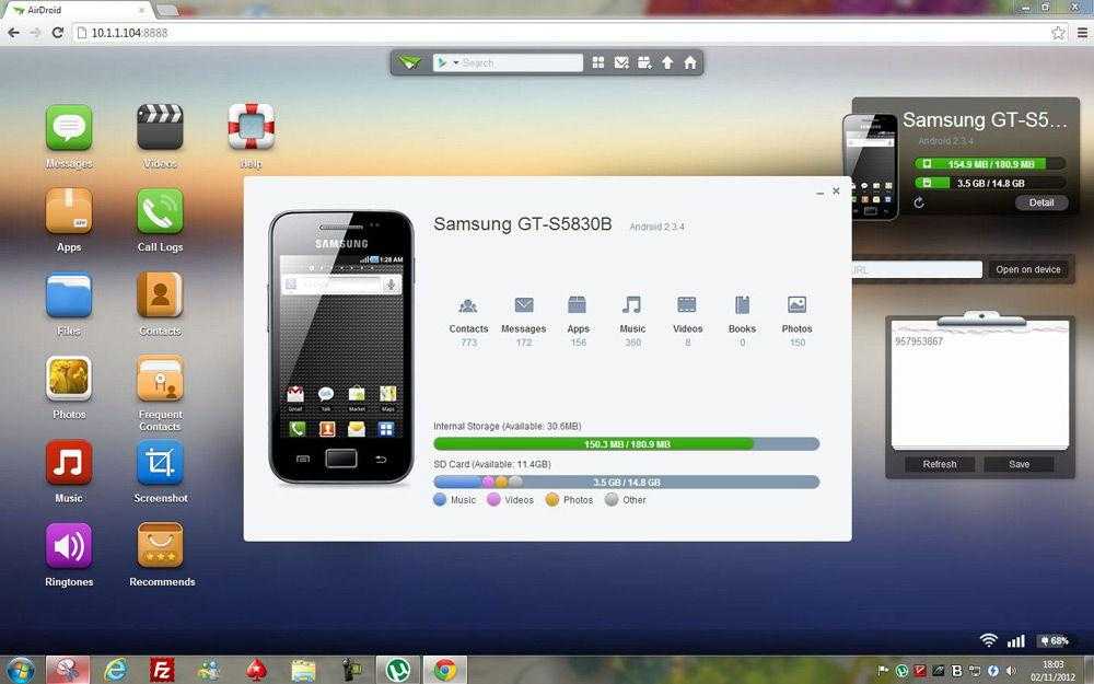 Простая программа, создающая в вашем браузере виртуальный рабочий стол Android-устройства. Подходит для передачи файлов между девайсами, прослушивания музыки и видео. Имеет слегка запутанный интерфейс.