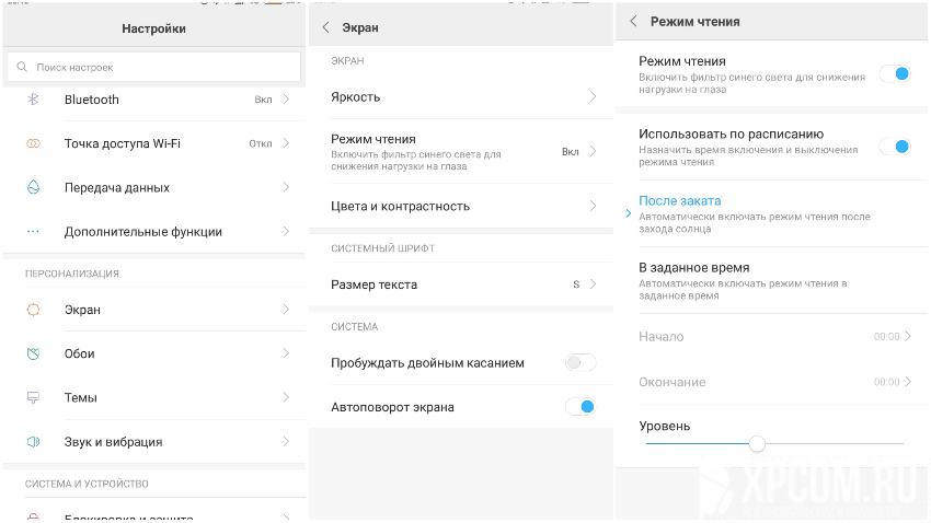 Если у вас телефон Xiaomi с прошивкой MIUI, можно пропустить описанные выше шаги, потому что разработчики MIUI упростили взаимодействие с ночным режимом. Правда называется он здесь, режим чтения.