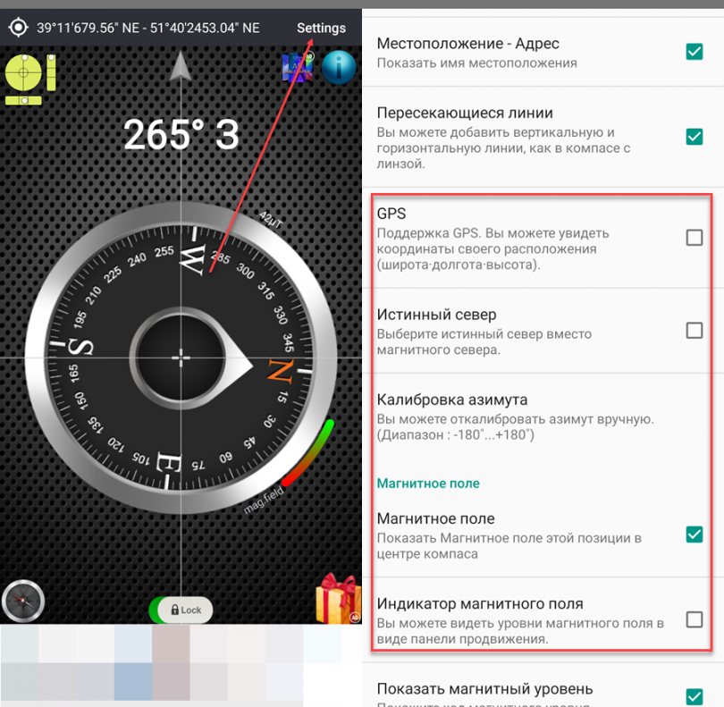 Шаг 3. Нажмите «Settings», чтобы перейти в настройки. Здесь вы можете посмотреть список доступных параметров, вручную откалибровать азимут, включить или отключить GPS, выбрать истинный север вместо магнитного.