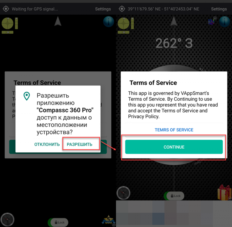 Шаг 2. Запустите приложение и выдайте ему доступ к данным о местоположении. Для этого нажмите «Разрешить». После этого примите пользовательские соглашения, нажав кнопку «Continue».