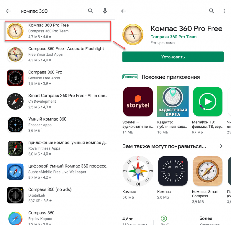 Шаг 1. Установите на телефон любой компас. В данной инструкции мы будем работать с приложением «Компас 360 Pro Free». Его можно бесплатно скачать на смартфон через Play Маркет.