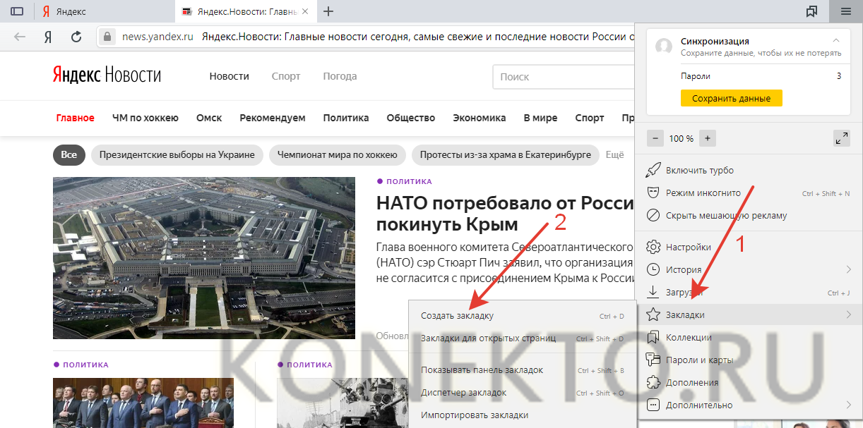 После этого нужно перевести курсор на «Закладки» и в появившемся окне выбрать опцию «Создать закладку».