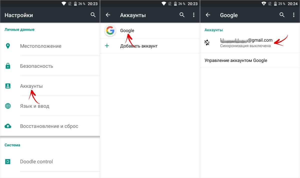 Когда возникают подобные ошибки в софте от Гугл, часто помогает выход и повторная авторизация в аккаунт. Как правило, это устраняет различные сбои. Для этого перейдите в меню настроек, прокрутите вниз, найдите пункт «Аккаунты». Откроется окно со всеми привязанными учетными записями. Нажмите на свою учетную запись Гугл. В некоторых телефонах и планшетах пункт называется «Пользователи и аккаунты».