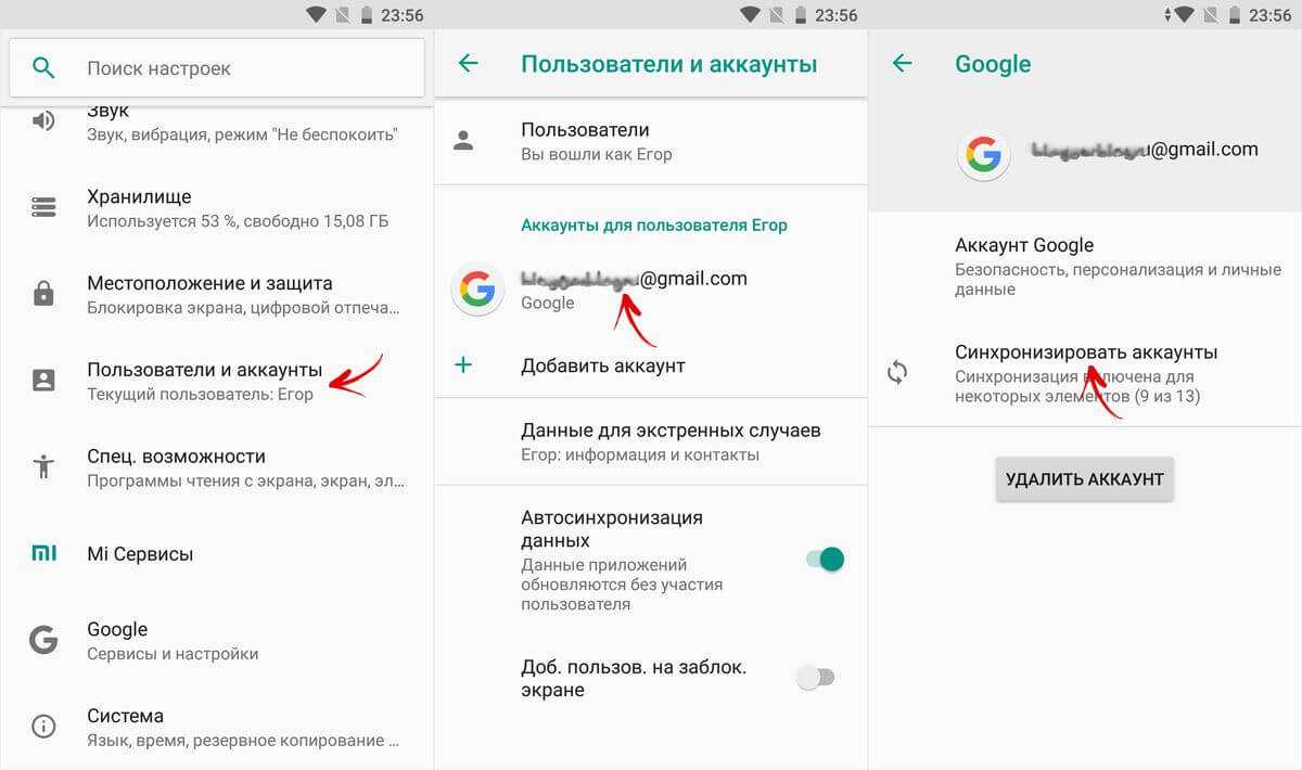 В Andrоid 8 и 9 зайдите в «Настройки» → «Пользователи и аккаунты», нажмите на адрес электронной почты и выберите «Синхронизировать аккаунты».