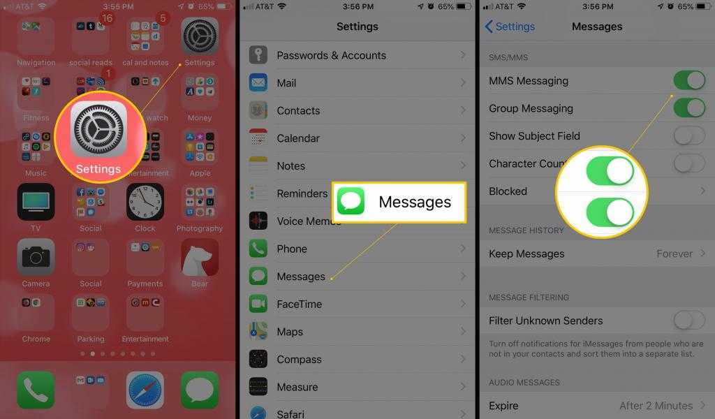 . Убедитесь, что пункты «iMessage» и «Отправить как SMS» включены.