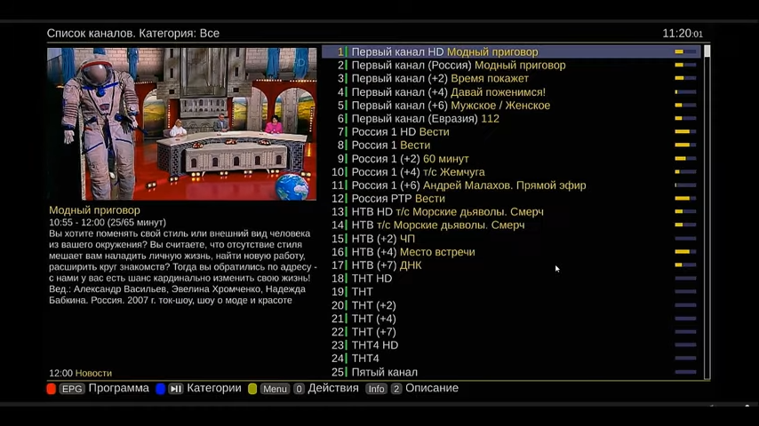 Приложению потребуется около двух минут, чтобы обновить телепрограмму. После этого появятся логотипы каналов, время и название передач. Управление будет удобнее пультом с клавишами Вверх/вниз/вправо/влево/ОК.