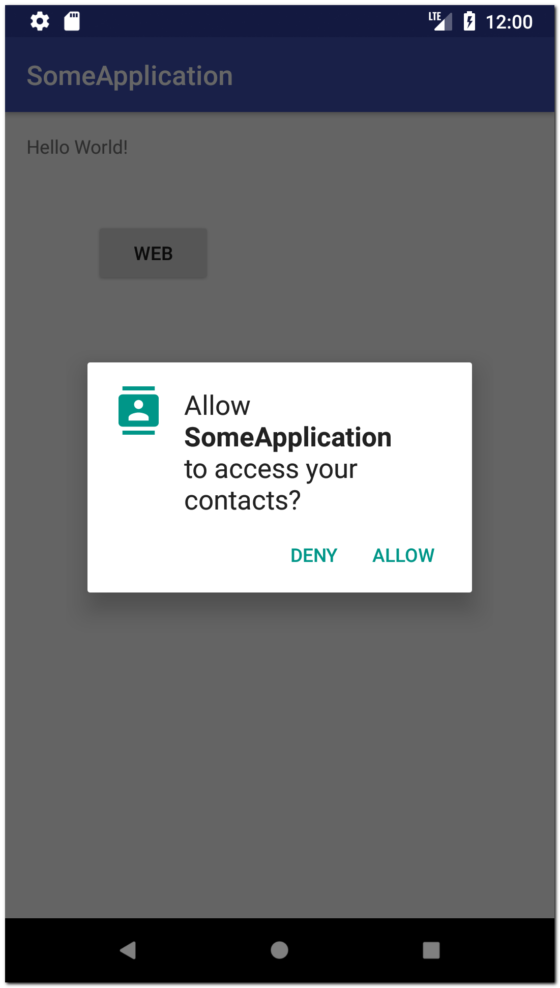 Здесь будет отображено разрешение, которое мы запросили методом requestPermissions. Пользователь может либо подтвердить его (ALLOW), либо отказать (DENY). Если будет запрошено сразу несколько разрешений, то на каждое из них будет показан отдельный диалог. И пользователь может какие-то разрешения подтвердить, а какие-то нет.