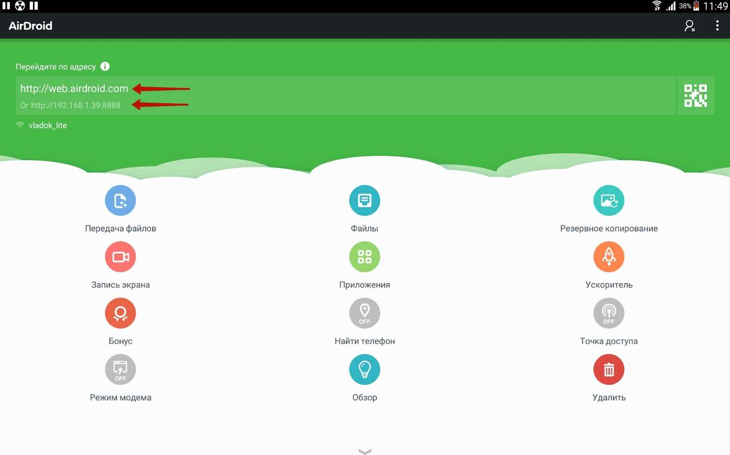 В верхней части программы будет отображено два адреса. По ним необходимо перейти на своем компьютере. Первый адрес используется в ситуации, когда вы уже зарегистрированы на официальном ресурсе Airdroid. Второй адрес – это цифры, точки и двоеточия. Он используется пользователями, которые на регистрацию не хотят тратить время.
