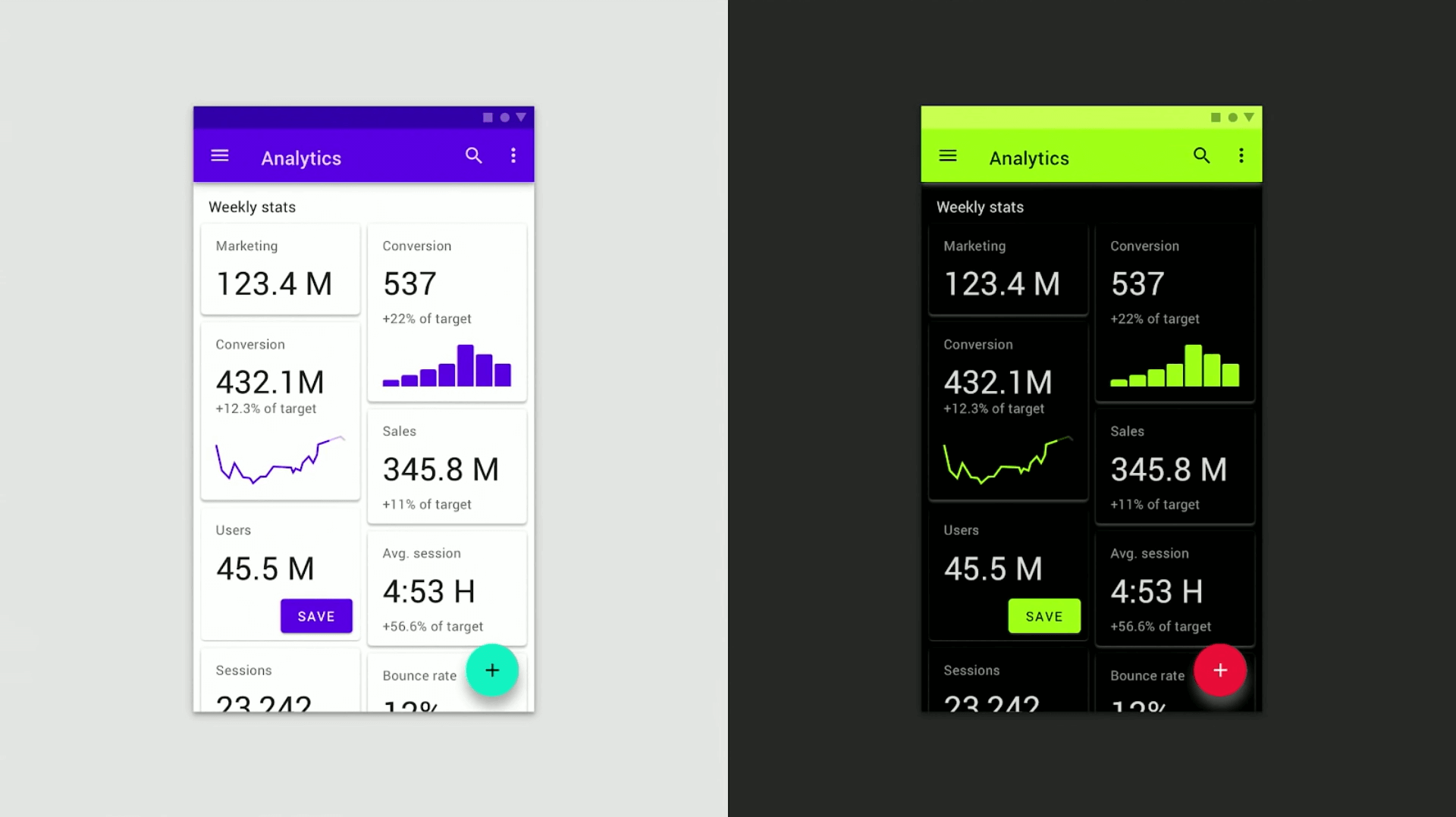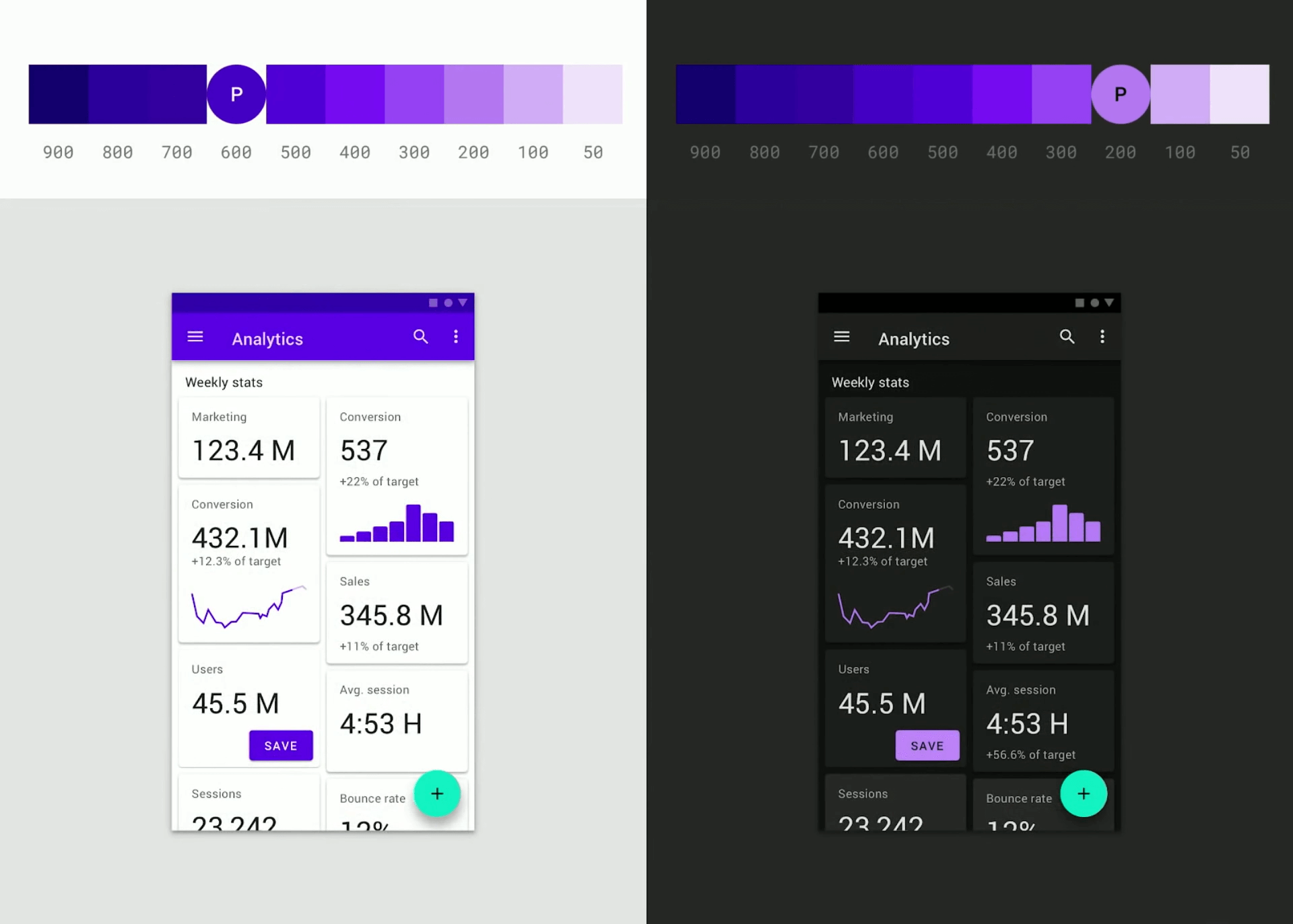 Дизайнеры Google сформулировали правило для подбора цветов: чем темнее фон, тем светлее должны быть цвета элементов интерфейса. Каждый цвет разбили на яркостную градацию от 900 до 50 и подобрали наиболее контрастные и приятные глазу оттенки: