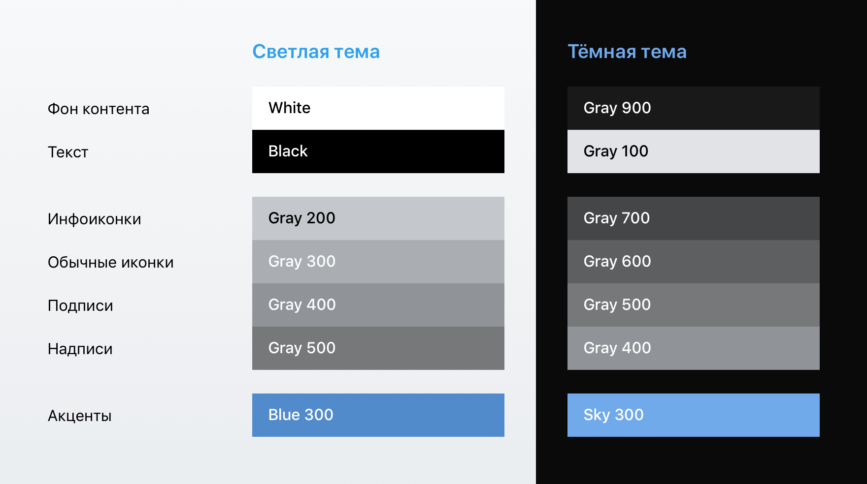 На тёмном фоне насыщенные цвета выделяются гораздо сильнее. Например, яркий синий цвет хорошо выглядит в светлой теме, но в тёмной он кажется гораздо ярче: