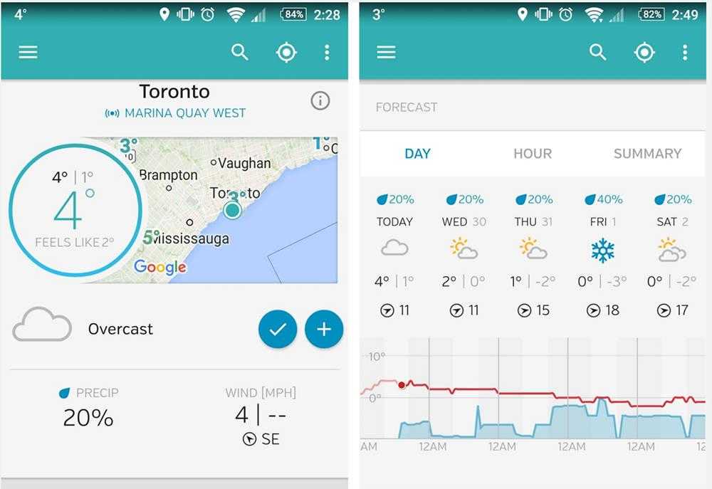 Android-смартфоны особенно хороши для любительских метеорологов, потому что операционная система поддерживает как уведомления, так и виджеты на главном экране, что позволяет превратить практически любой гаджет в портативную метеостанцию. Виджет лучшего погодного приложения для Android – тот, который предоставляется приложением Weather Timeline. Виджет чрезвычайно хорошо разработан, красочен, прост в использовании и может быть по-разному настроен. Виджет может показывать погоду как на день, так и на неделю. Можно настроить его на отображение только текущей температуры или полноценной почасовой шкалы. Weather Timeline отображает всю информацию о погоде на временной шкале, поэтому узнать погоду на ближайшее время можно за пару кликов.
