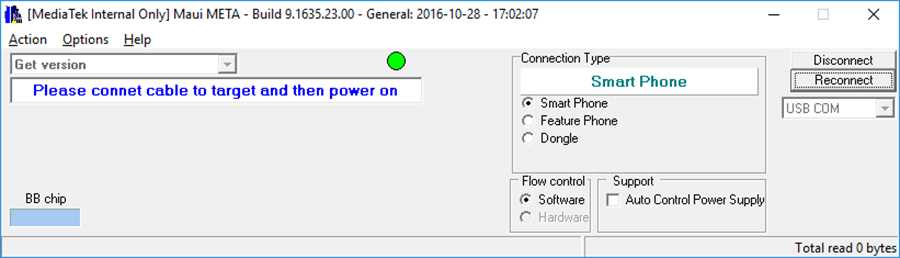 - После загрузки драйверов устройства и CDC Serial, запустите ПО. В его настройках укажите тип устройства (Platform Type) – «Smartphone»; COM-порт (COM Port) – «USB COM». Выключите смартфон, выполните его сопряжение к устройству;