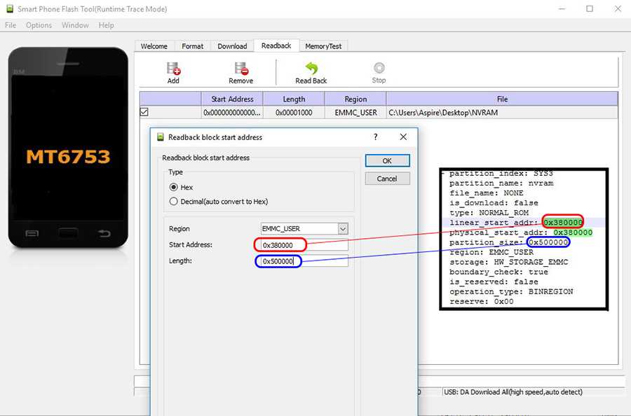 - Скопировать значения linear_start_addr и partition_size в SP Flash Tool в Start Address и Length соответственно