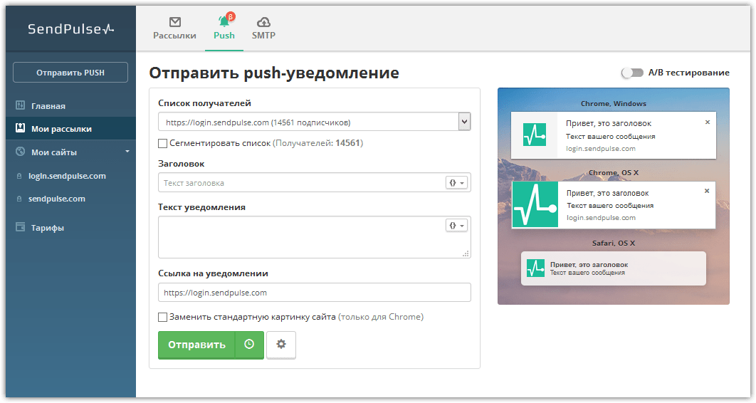 Выбрать варианты рассылки – браузеры или приложения для телефонов.