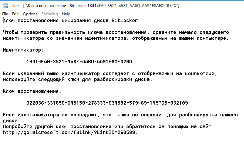 В настройках по умолчанию ключ экспортируется как простой текстовый файл с узнаваемым именем: «Ключ восстановления BitLocker #», где вместо # пишется идентификатор компьютера (да, прямо в имени файла!). Сам ключ выглядит так.