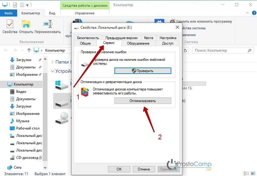 - После этого откроется окно со свойствами накопителя, в нем необходимо перейти на вкладку «Сервис» и выбрать пункт «Оптимизировать»;