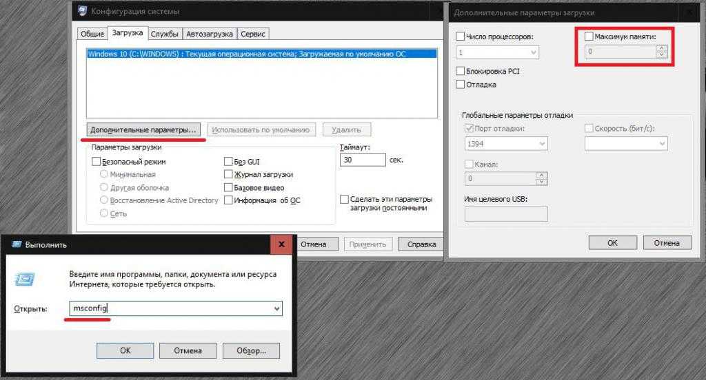 Откройте вкладку Загрузки и выберите текущую ОС из списка, если установлено несколько. Нажмите на кнопку «Дополнительные параметры». Снимите флажок с опции «Максимум памяти» и щелкните на «ОК» для сохранения изменений.