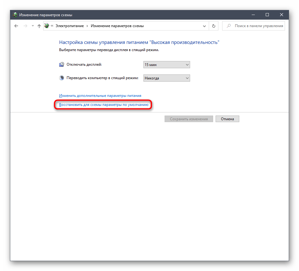 В противном случае перейдите к «Настройка схемы электропитания», нажав по соответствующей надписи возле активной настройки. Там щелкните по «Восстановить для схемы параметры по умолчанию» и подтвердите внесение изменений.