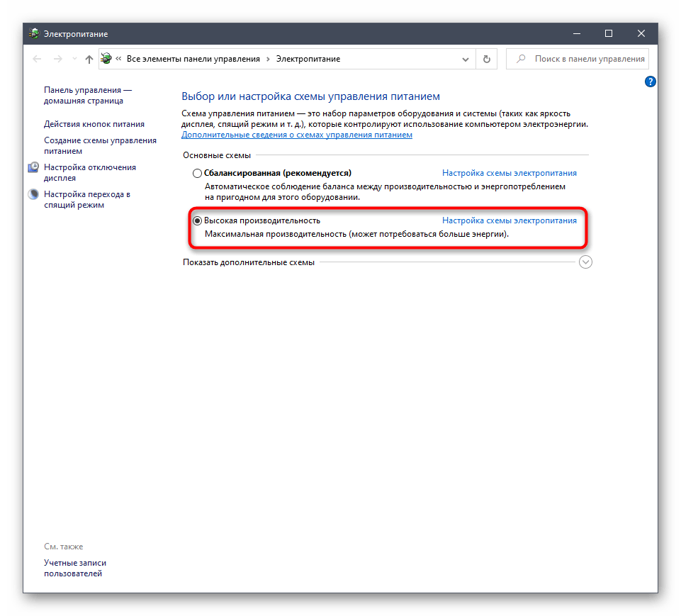 В предпоследнем способе нашего сегодняшнего материала хотим поговорить о настройке плана электропитания. Здесь вы увидите два совета, связанных с этим аспектом операционной системы. Первый позволяет установить стандартную конфигурацию для максимальной производительности, а второй отвечает за сброс параметров до состояния по умолчанию и пригодится в тех случаях, когда пользователь изменял какие-то параметры плана.