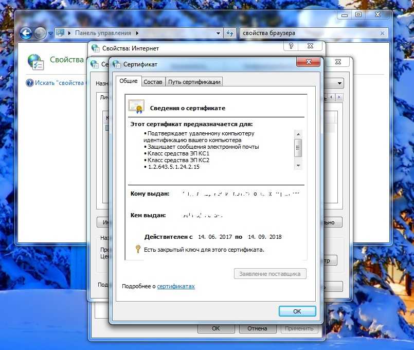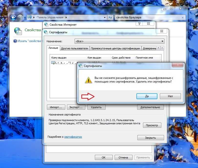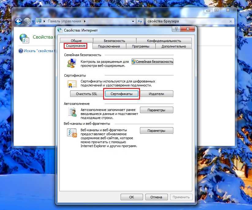 Другой вариант действий включает прохождение по такому пути: «Центр управления сетями и общим доступом» — «Свойства браузера» — «» — «Сертификаты».