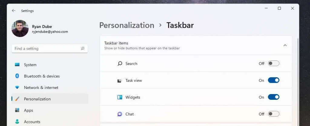 - Используйте раздел «Элементы панели задач», чтобы включить или отключить отображение следующих элементов на панели задач: поиск Windows, представление задач, виджеты или чат Teams.