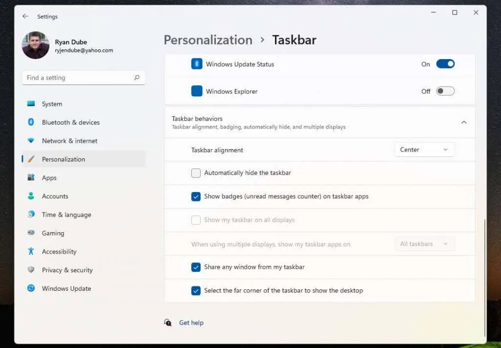 - Прокрутите вниз до «Поведение панели задач», чтобы настроить выравнивание панели задач, включить значки для непрочитанных сообщений, несколько параметров отображения, совместное использование окон и параметры отображения рабочего стола.