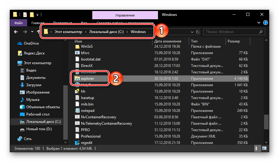 «Проводник» мало чем отличается от обычных программ, поэтому у него тоже есть свой исполняемый файл, который и может использоваться для запуска. explorer.exe находится по представленному ниже пути, практически в самом низу этой папки. Отыщите его там и откройте двойным кликом ЛКМ