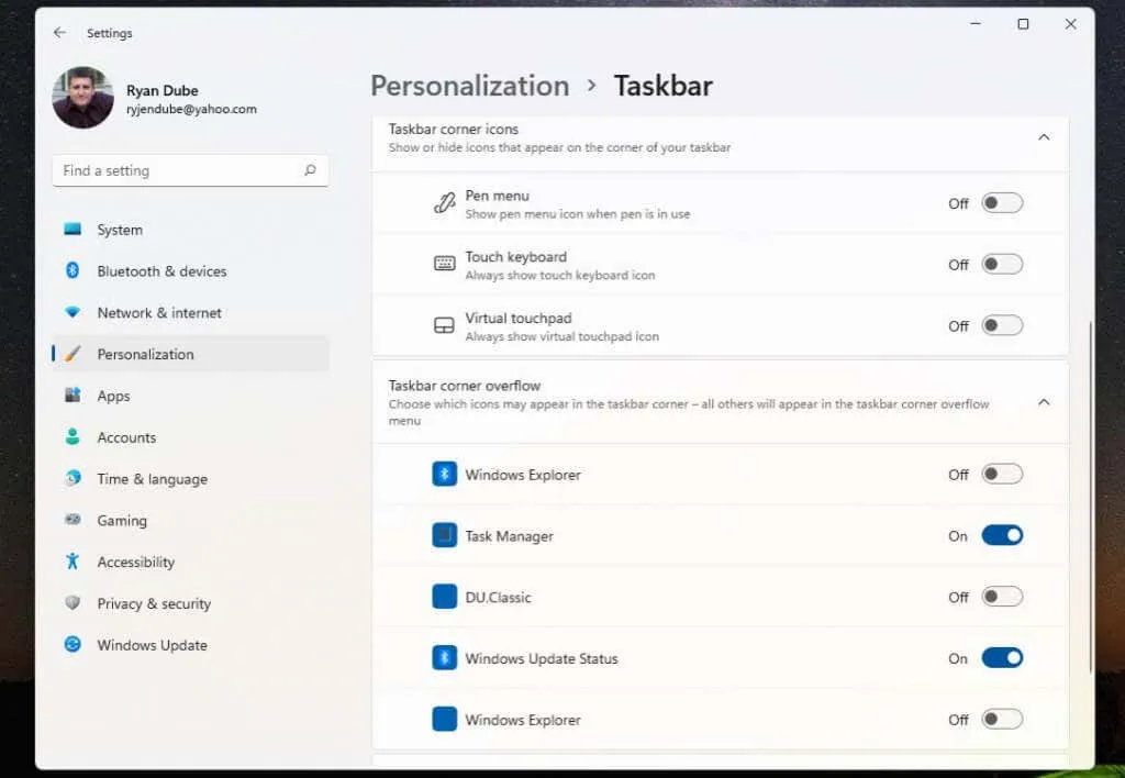 - В разделе «Переполнение угла панели задач» вы можете настроить угол панели задач для отображения значков для таких элементов, как проводник Windows, диспетчер задач или обновления Windows.