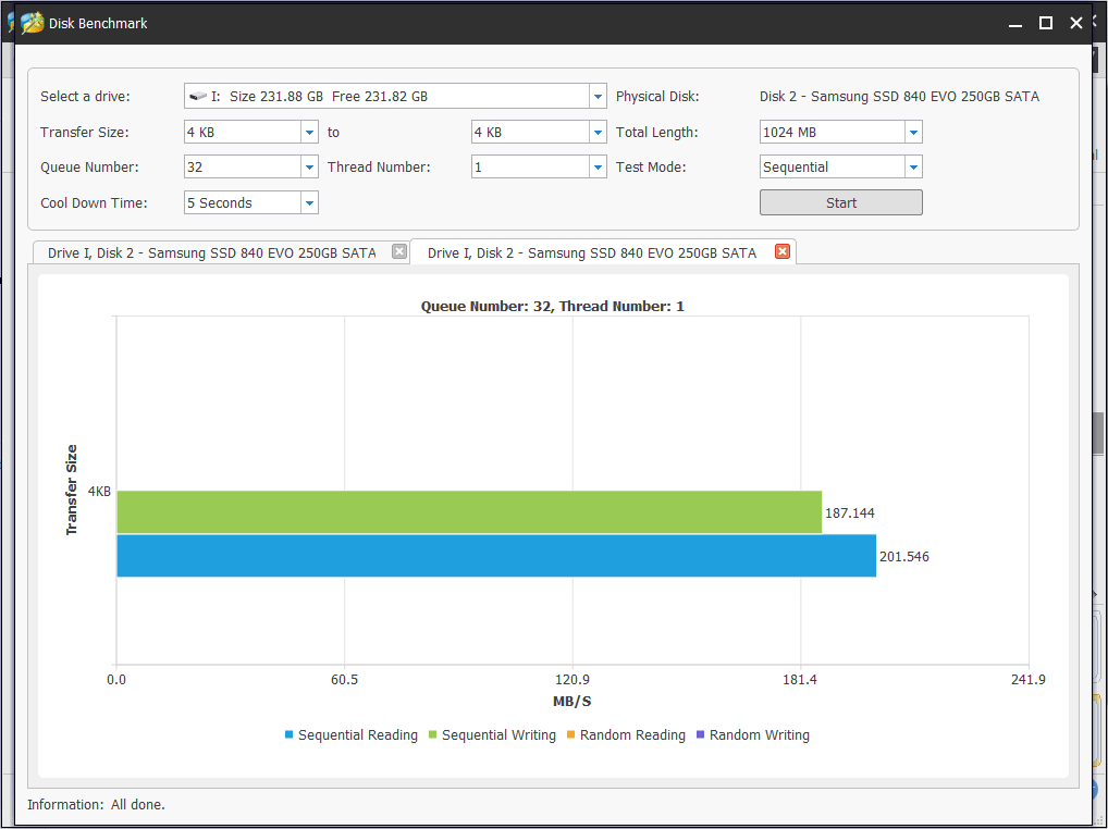 Шаг 2. В окне Disk Benchmark вы можете выбрать диск или раздел ПК и установить размер передачи, общую длину, номер очереди, номер потока, время охлаждения и режим тестирования (последовательный, случайный, а также последовательный и случайный).
