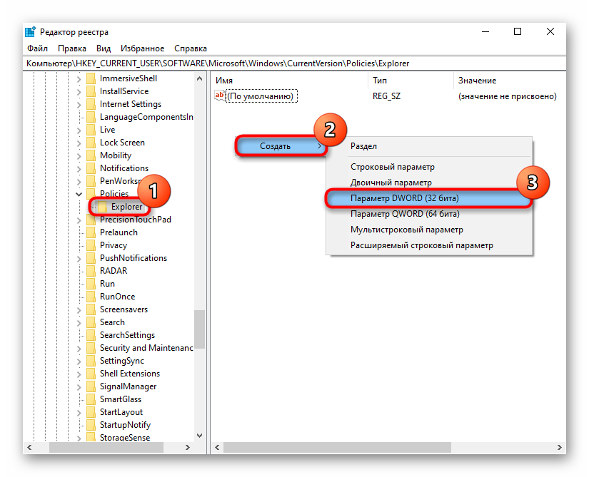 У некоторых пользователей будет отсутствовать подпапка «Explorer», поэтому ее придется создать самостоятельно. Для этого щелкните правой кнопкой мыши по «Policies» в левом столбце и выберите пункт «Создать раздел», а затем переименуйте его в «Explorer».