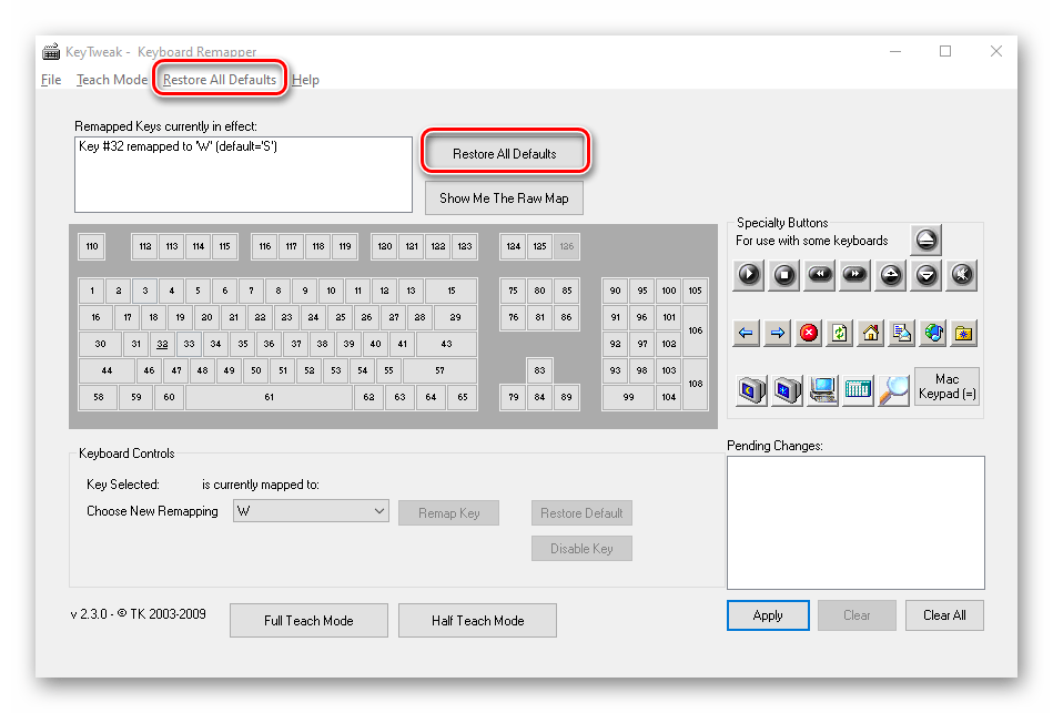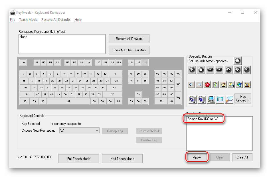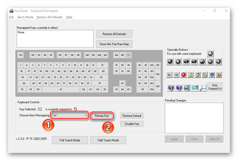 - Переназначить специальные клавиши, кнопки мультимедиа (воспроизведения и т.д.), или «игровые» клавиши (напр., заменив кнопку «Win») на различные клавиши клавиатуры.