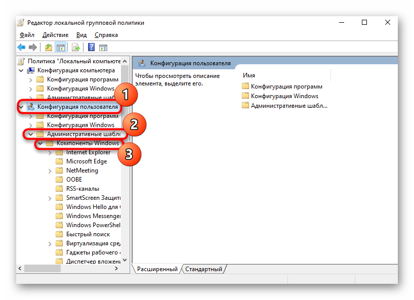 Последовательно разворачивайте следующие разделы: «Конфигурация пользователя» > «Административные шаблоны» > «Компоненты Windows».